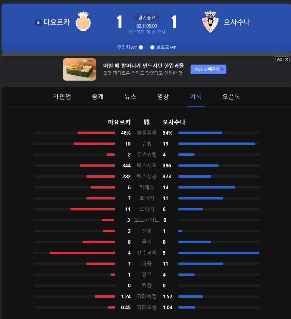 오사수나의 보요모는 후반 추가시간(94분)에 극적인 동점골을 터뜨리며 팀을 구했습니다. 그는 슈팅 2회, 패스 성공 75%로 준수한 활약을 펼쳤습니다.