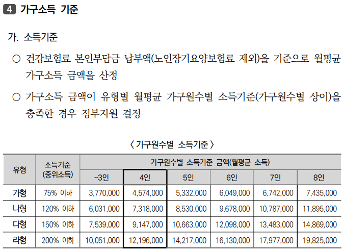 | 소득 기준 | 중위소득 150% 이하(중위소득 구간 계산하기) |