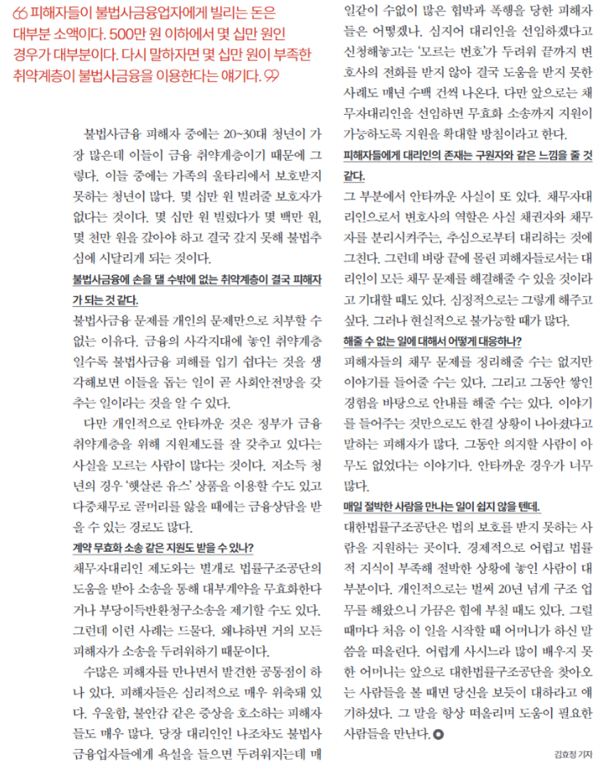 | 불법사금융 피해자 | 무료 변호사 선임 및 법률 지원 |