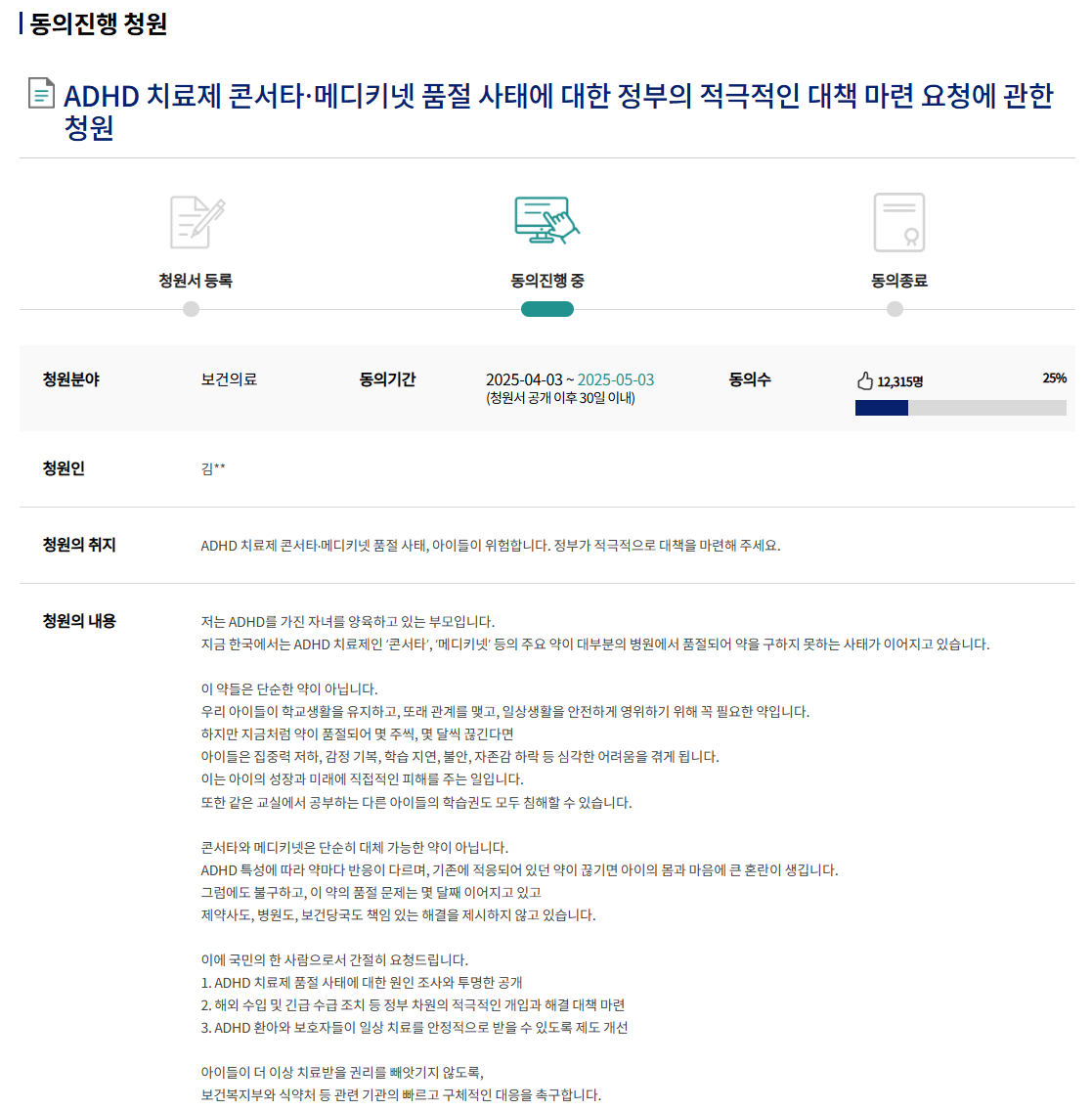 청원인은 ADHD를 가진 자녀를 키우는 부모입니다. 그는 콘서타와 메디키넷의 품절로 아이가 심각한 정서적·신체적 혼란을 겪고 있다고 호소합니다. 청원서에는 다음과 같은 요청이 담겨 있습니다: